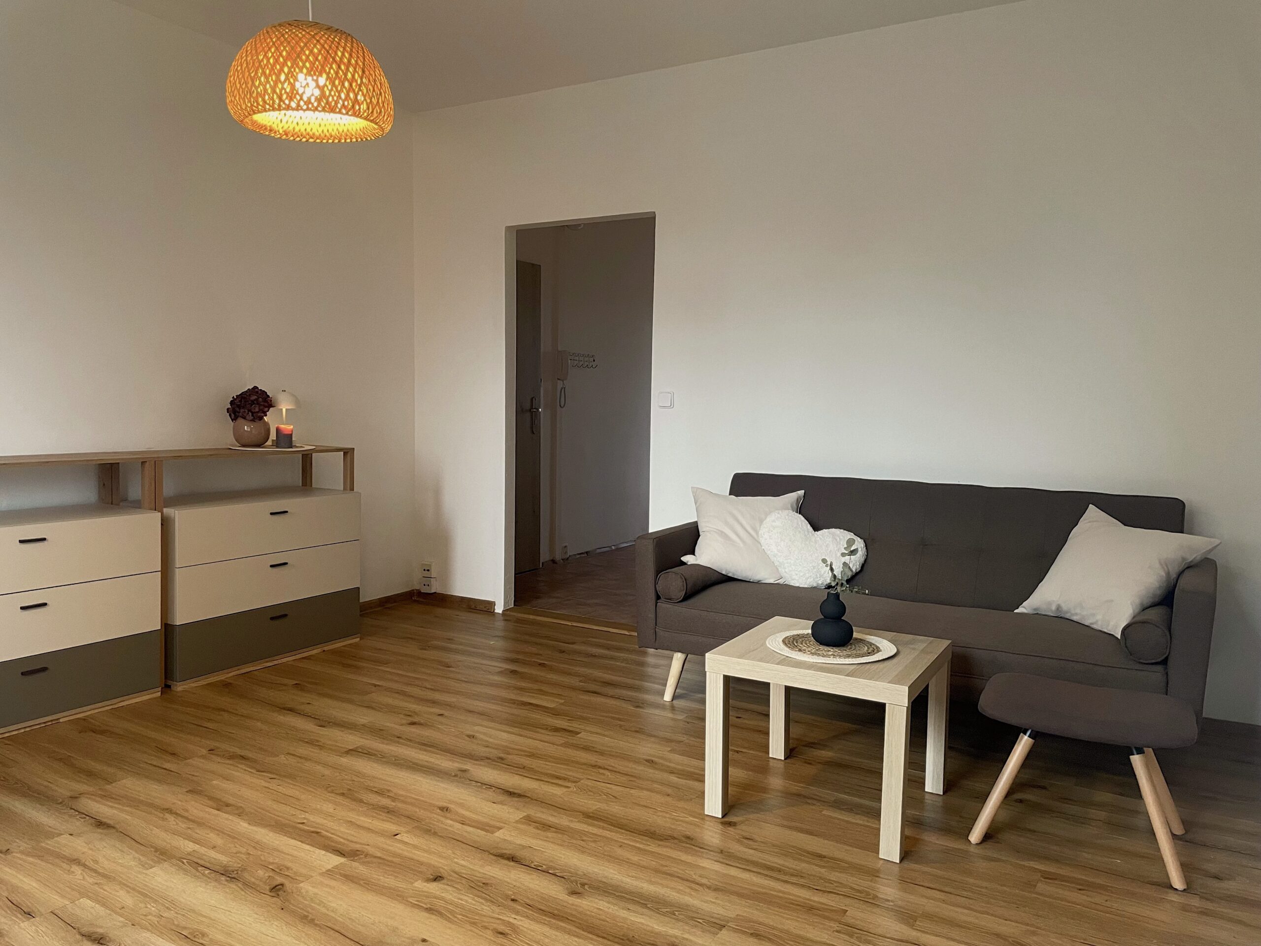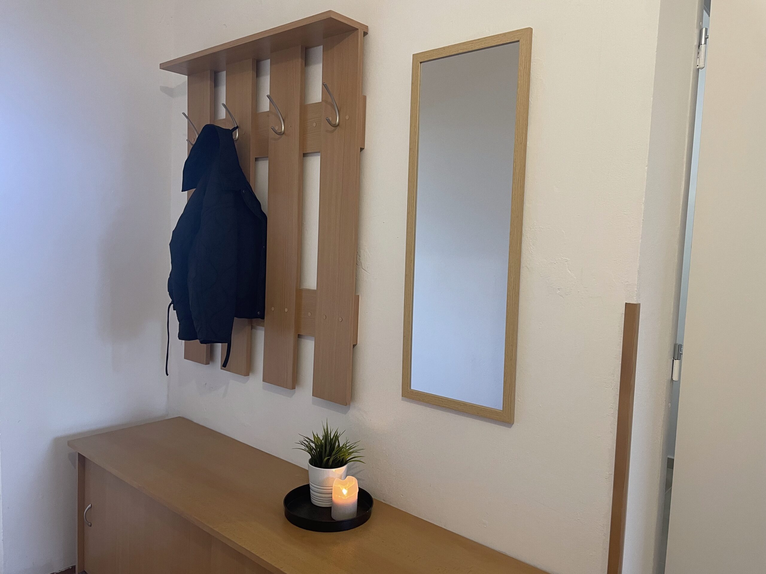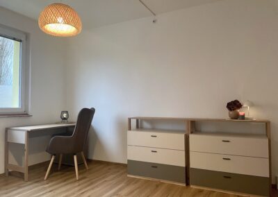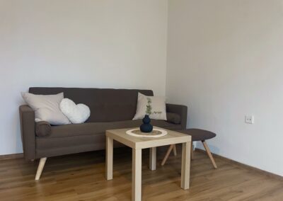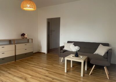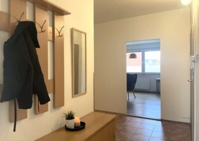 Dispozice zahrnuje obývací pokoj s pohovkou, úložnými prostory a pracovní kout, samostatnou ložnici se skříní, kompletně vybavenou kuchyni s kuchyňským koutem, koupelnu se sprchovým koutem a WC a prostornou předsíň rovněž s úložnými prostory.