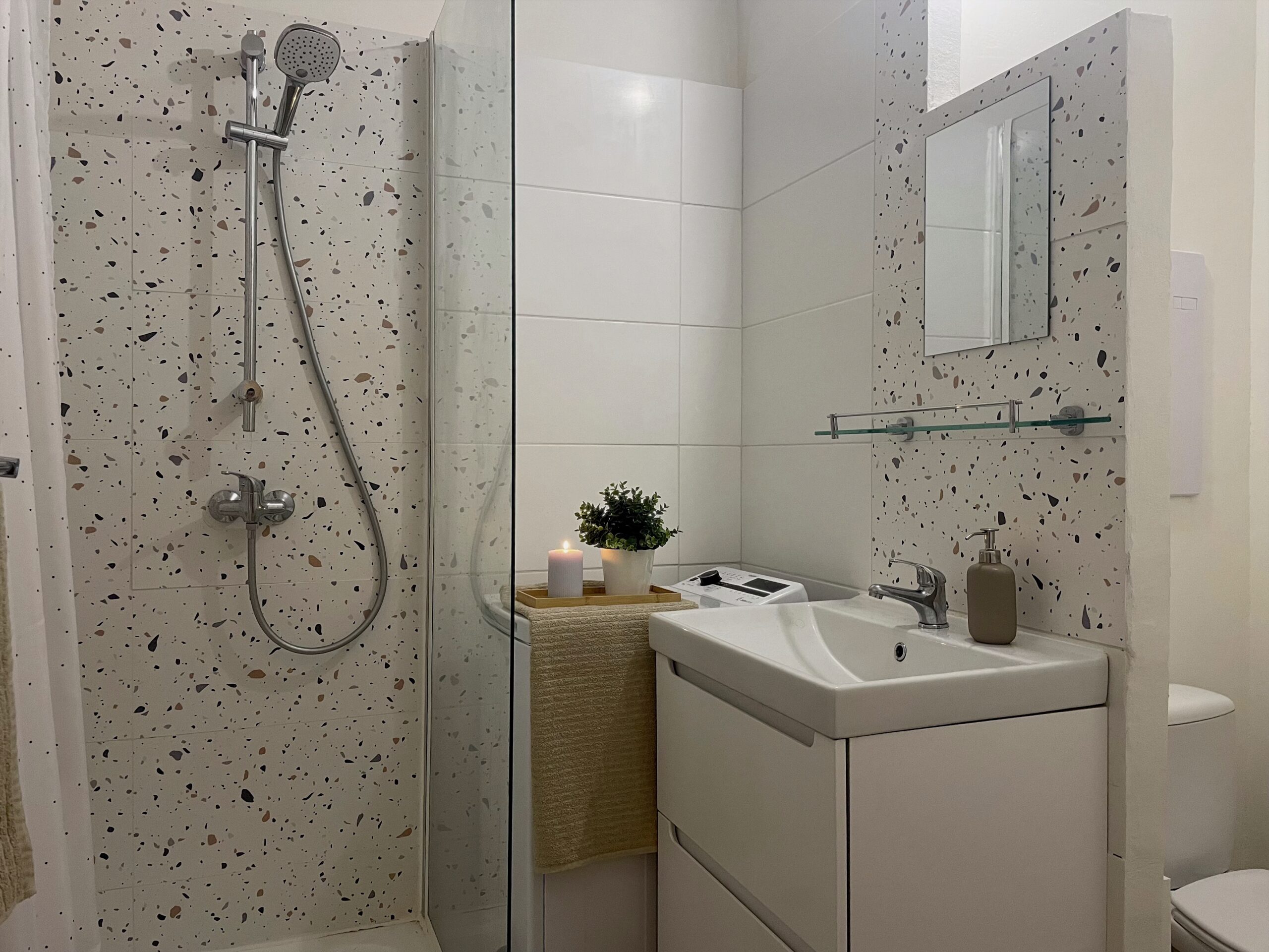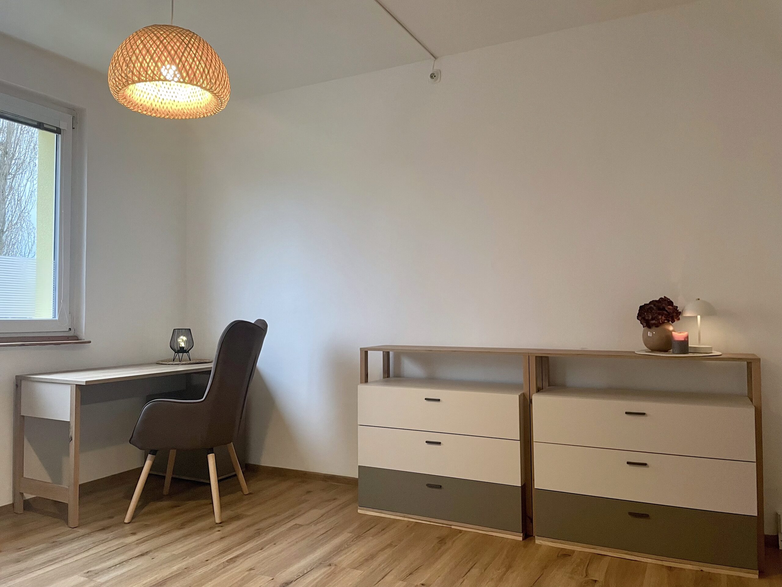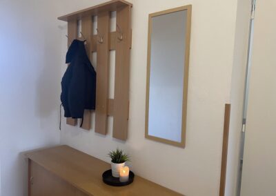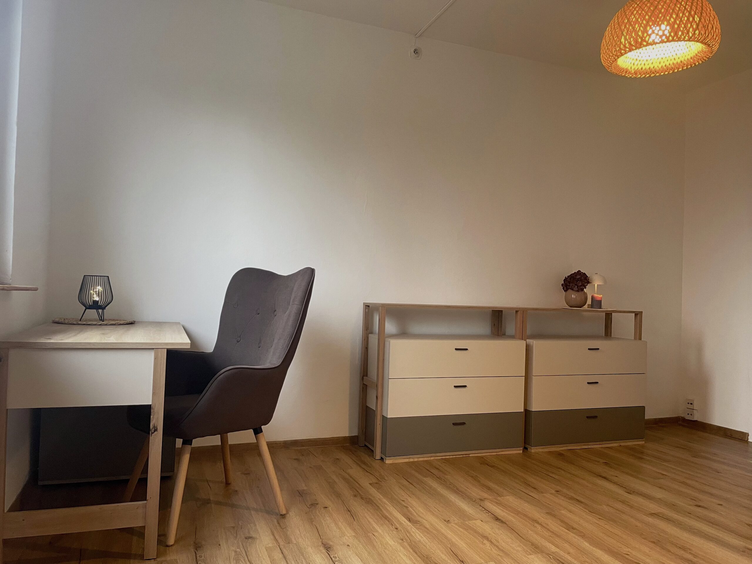 Dispozice zahrnuje obývací pokoj s pohovkou, úložnými prostory a pracovní kout, samostatnou ložnici se skříní, kompletně vybavenou kuchyni s kuchyňským koutem, koupelnu se sprchovým koutem a WC a prostornou předsíň rovněž s úložnými prostory.